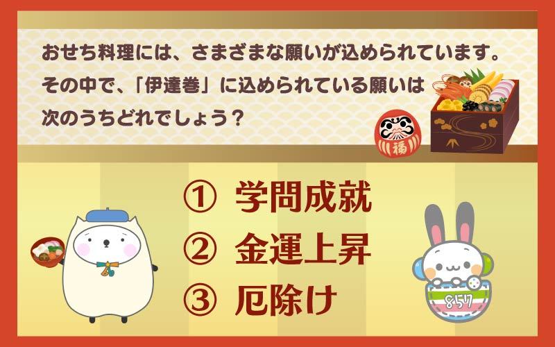 おせち料理には、さまざまな願いが込められています。その中で、「伊達巻」に込められている願いは次のうちどれでしょう?