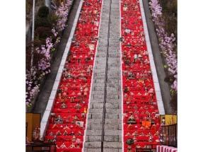 JR水郡線常陸大子駅から徒歩5分。本町通りにある十二所神社の参道、通称「百段階段」に約1,000体の雛人形が飾られます。年に一度しか見られないその光景はまさに壮観。