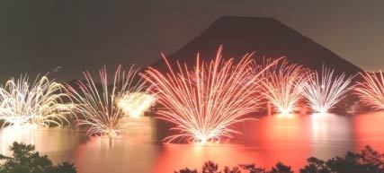 榛名富士を背景に、次々とボートから投げ込まれる水中花火は、いくつもの扇を開いたように湖面を鮮やかに飾る。また、国内最大級のレーザー装置で、さらに幻想的な夜を演出。