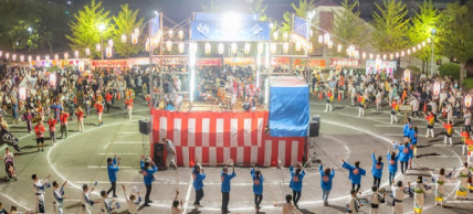 つが市民盆踊り大会の共催事業。浴衣やはっぴ姿の踊り手がやぐらを組み、地元団体によるお囃子に合わせて賑やかに踊る。フィナーレではスターマインを中心に約1,000発の花火が打ち上げられ、夜空に大輪の花を咲かせる。